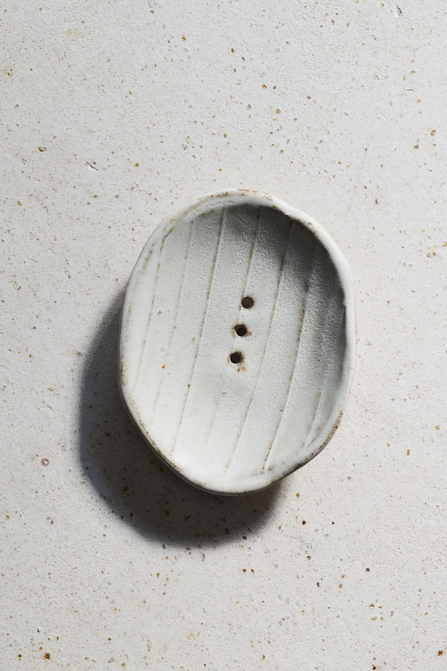 This handmade ceramic soap dish is crafted with care and finished in calming shades of soft sand white.