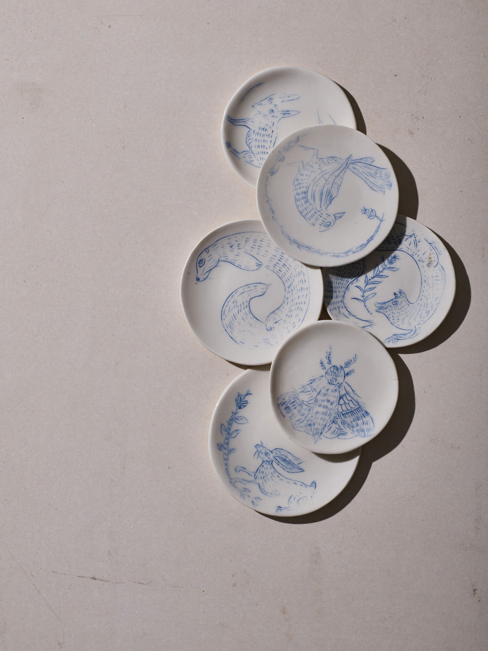 Each of these small porcelain plates (approx. 14 cm) is carefully shaped and hand-painted, carrying the quiet spirit of craftsmanship. The blue illustrations draw inspiration from totem animals, symbols of strength, guidance, and connection to nature.